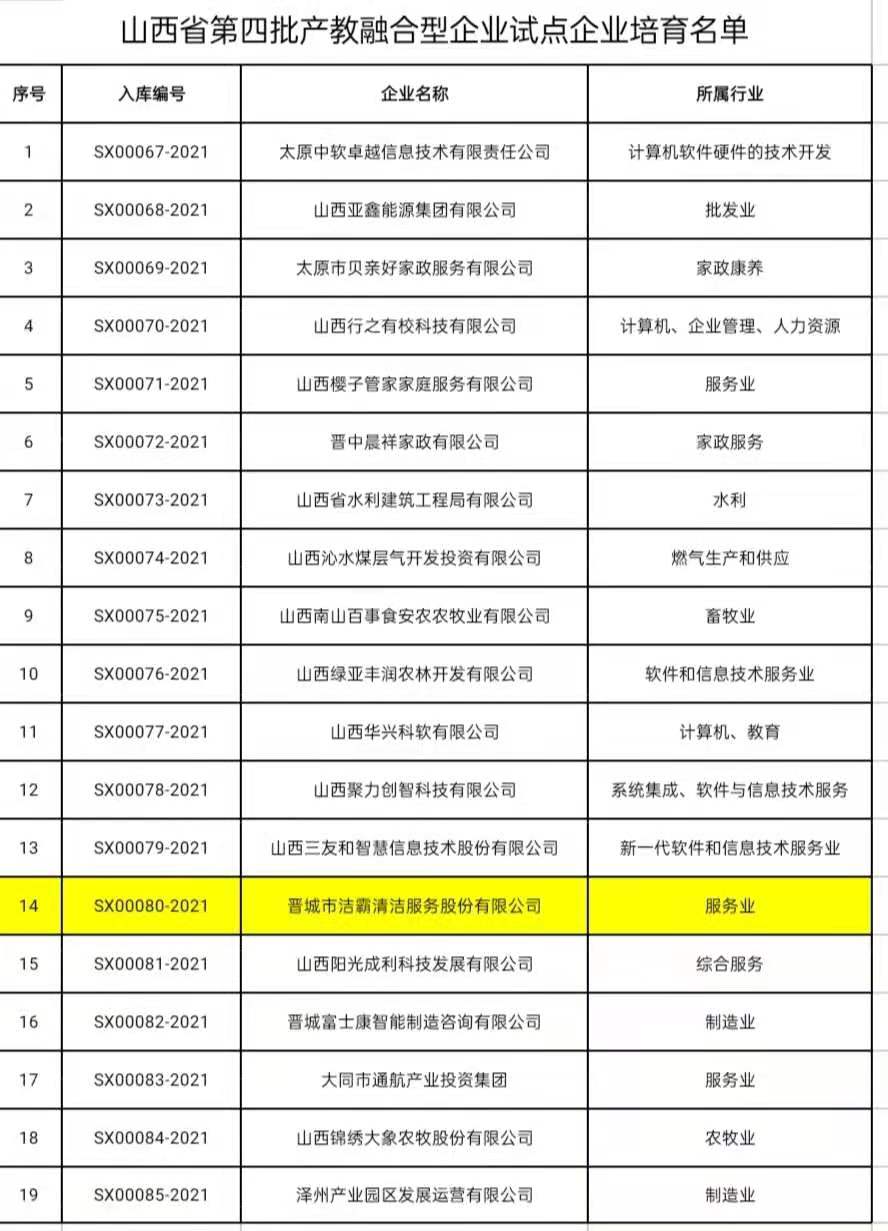晉城市潔霸清潔服務(wù)股份有限公司納入山西省產(chǎn)教融合型試點(diǎn)企業(yè)建設(shè)培育庫(kù)
