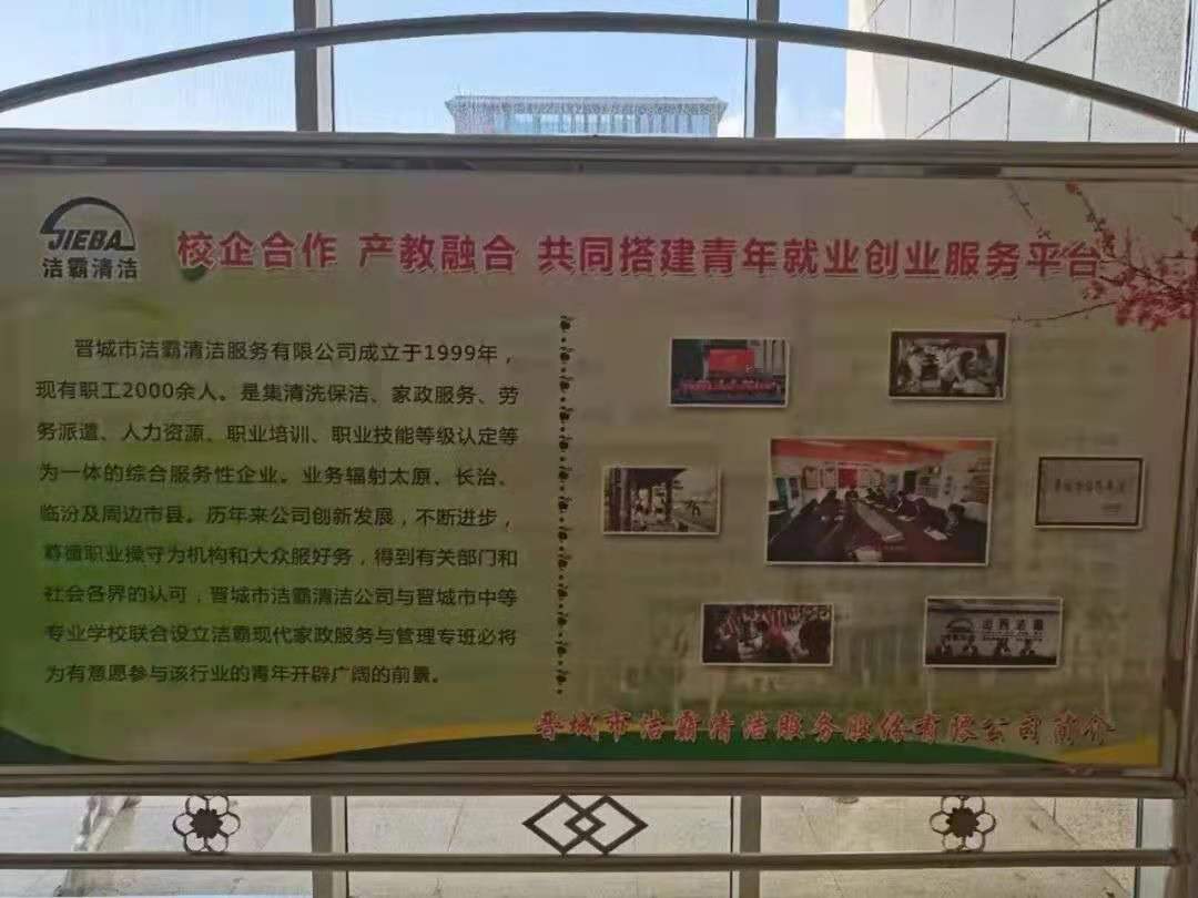 5月25日,是晉城市中等專業(yè)學(xué)校的“家長開放日”;顒赢(dāng)天,晉城潔霸清潔服務(wù)股份有限公司攜手晉城市中等專業(yè)學(xué)校,共同開展了“校企合作,產(chǎn)教融合, 共同搭建青年就業(yè)創(chuàng)業(yè)服務(wù)平臺”主題活動。