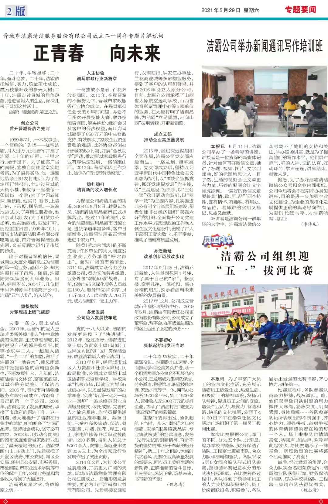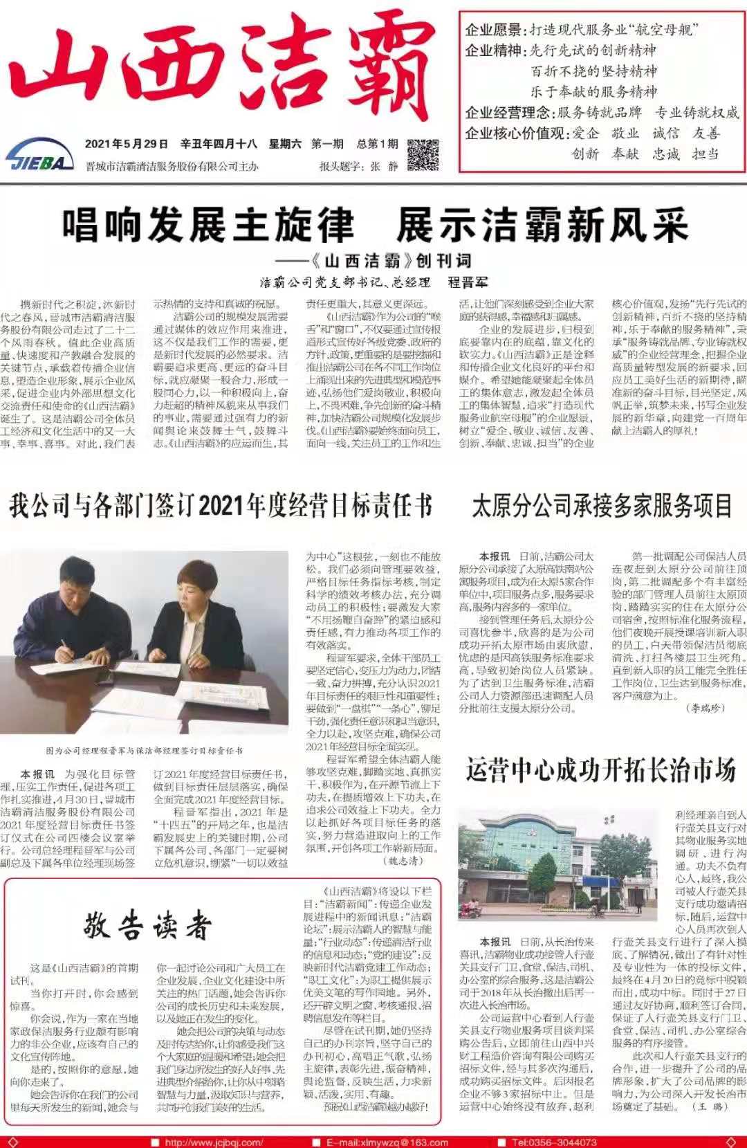 今天是2021年5月29日,經過一個多月的緊張籌辦,《山西潔霸》報紙終于創(chuàng)刊啦!這是潔霸人的一件大喜事,也是潔霸人的驕傲!伴隨著《山西潔霸》紙質版的內部發(fā)行,電子版也同步與你見面了。希望你能通過這個宣傳窗口,更好地走近潔霸,了解潔霸,關注潔霸,支持潔霸。