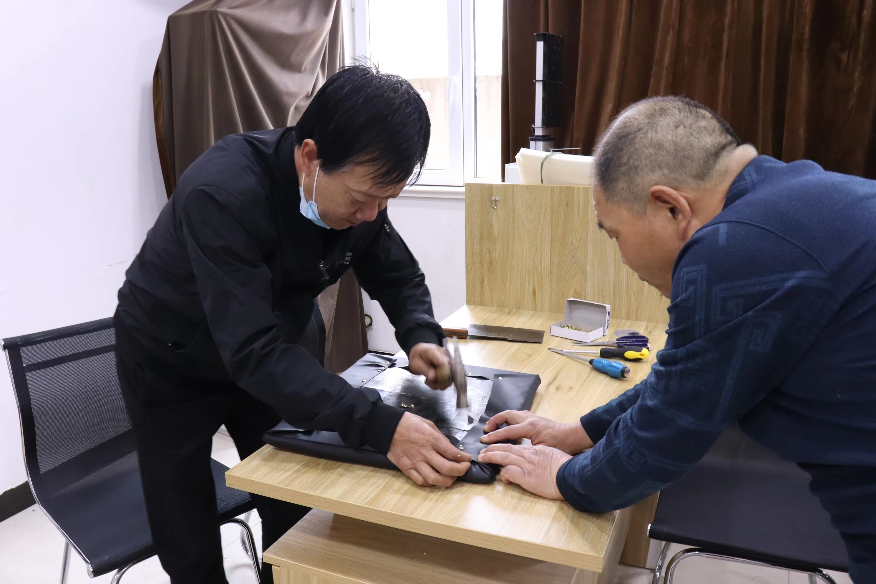 說干就干。他們買來了海綿 、面料 、釘子,憑借衛(wèi)師傅以前的木工技術和田師傅現(xiàn)有的維修技能,對破損的椅子進行了集中維修。叮叮當當……敲敲打打,手腳并用,不亦樂乎……