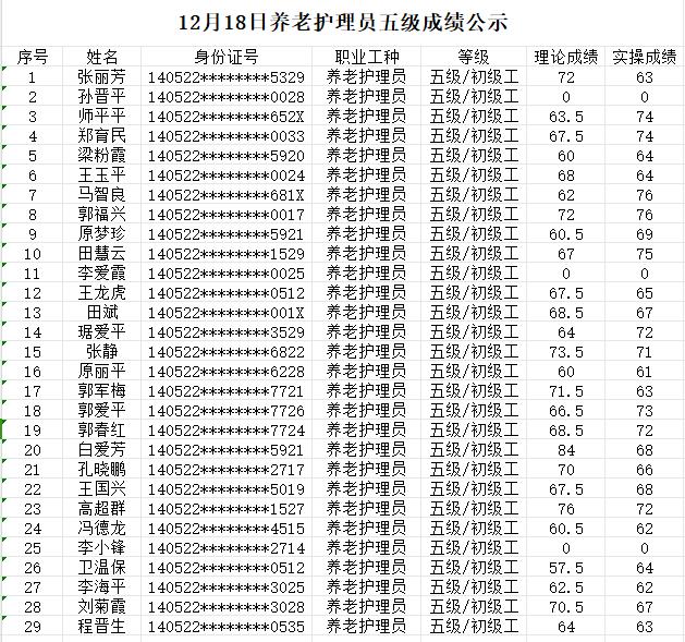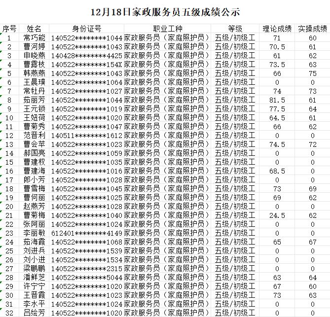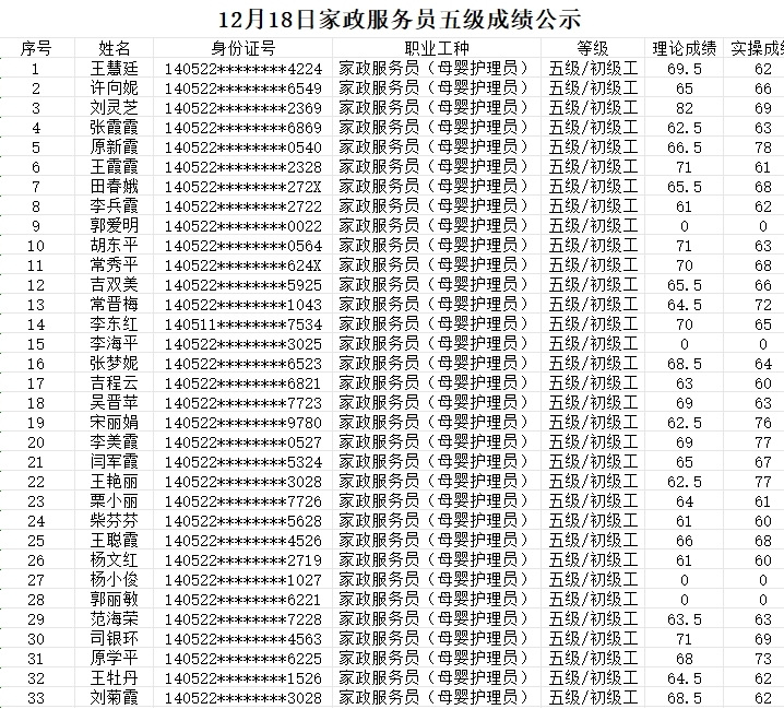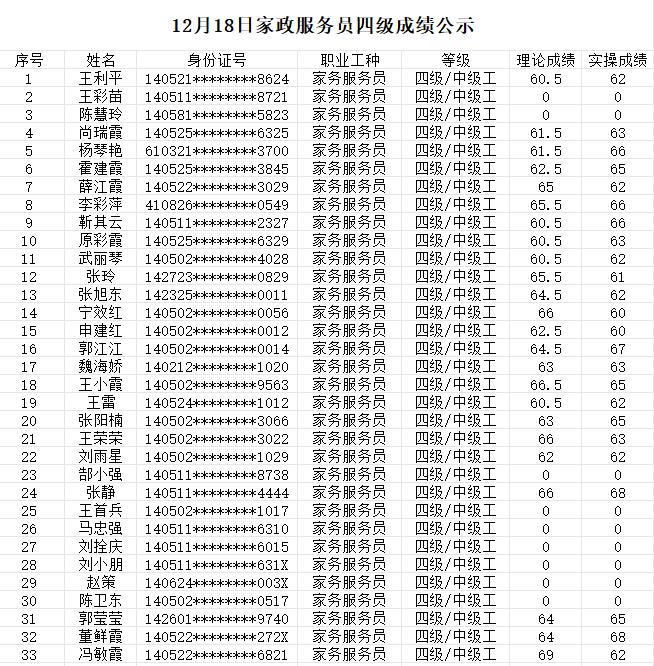 晉城市潔霸清潔服務(wù)股份有限公司職業(yè)技能等級(jí)認(rèn)定中心現(xiàn)將2023年12月18日認(rèn)定人員成績公示如下: