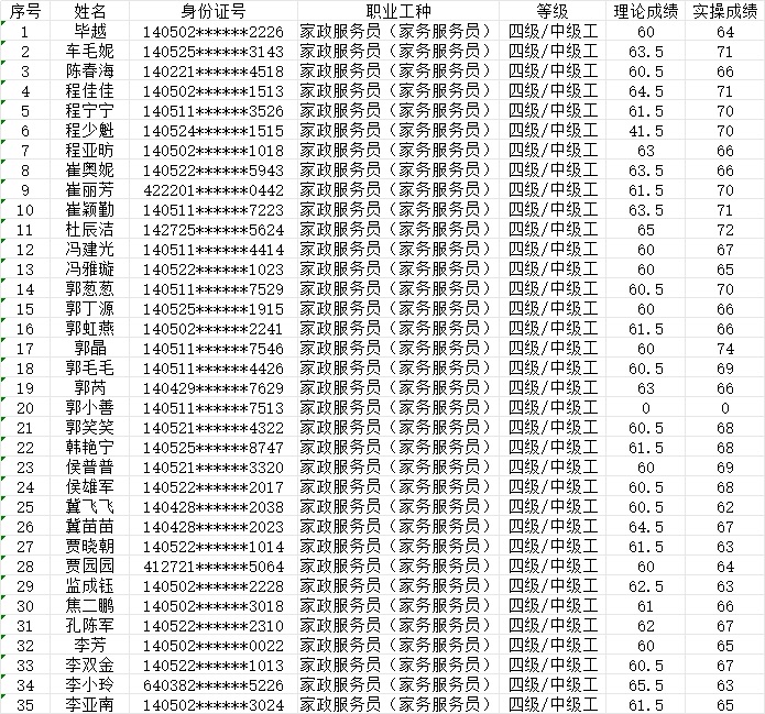 晉城市潔霸清潔服務股份有限公司職業(yè)技能等級認定中心2024年1月14日第1批家政服務員中級認定人員成績公示