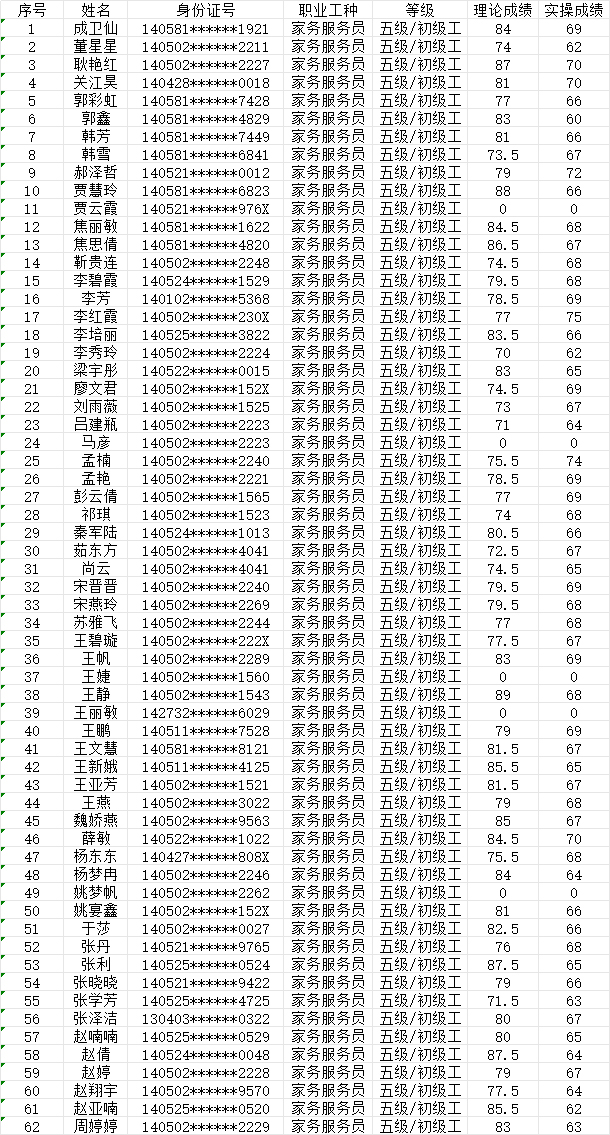 晉城市潔霸清潔服務(wù)股份有限公司職業(yè)技能等級認(rèn)定中心2024年7月20日第22批家政服務(wù)員初級認(rèn)定人員成績公示