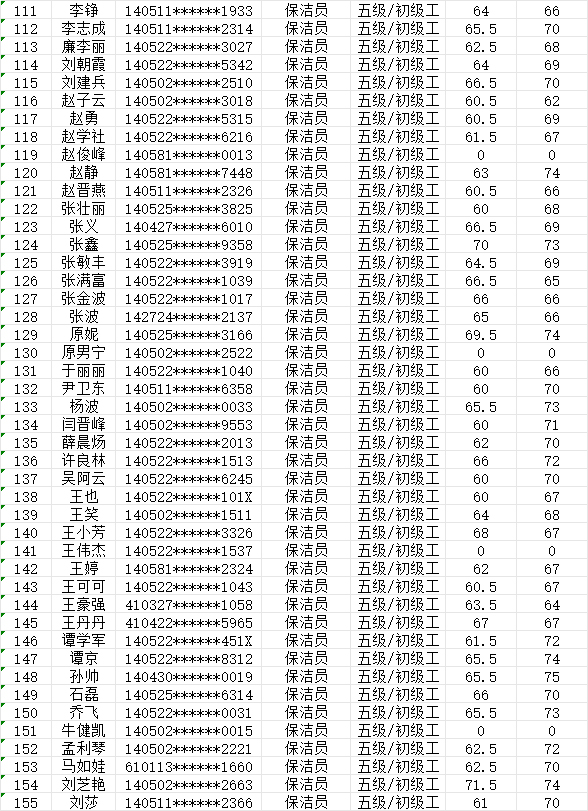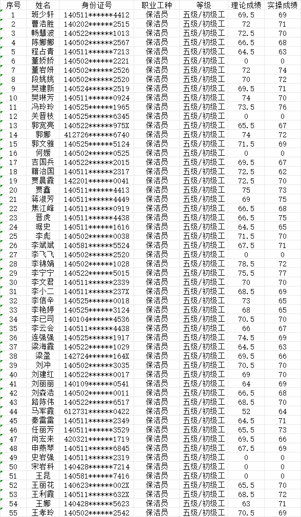 晉城市潔霸清潔服務(wù)股份有限公司職業(yè)技能等級(jí)認(rèn)定中心現(xiàn)將2024727日認(rèn)定人員成績(jī)公示如下: