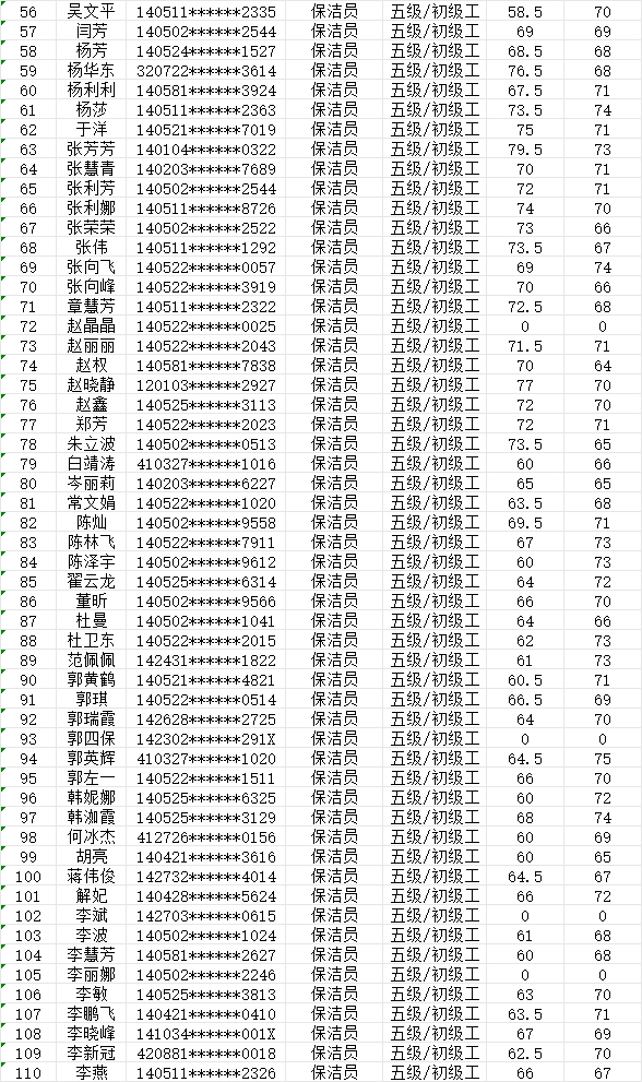 晉城市潔霸清潔服務(wù)股份有限公司職業(yè)技能等級(jí)認(rèn)定中心2024年7月27日第25批保潔員初級(jí)認(rèn)定人員成績(jī)公示