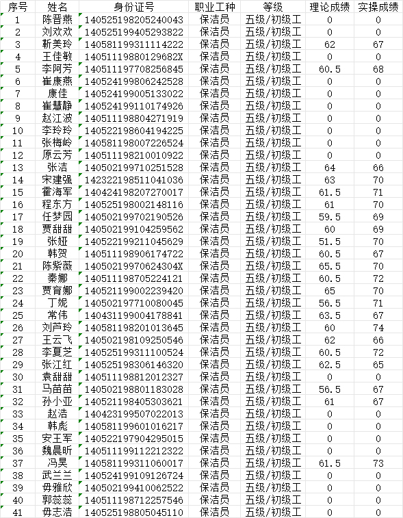 晉城市潔霸清潔服務股份有限公司職業(yè)技能等級認定中心2024年8月4日第27批保潔員初級認定人員成績公示