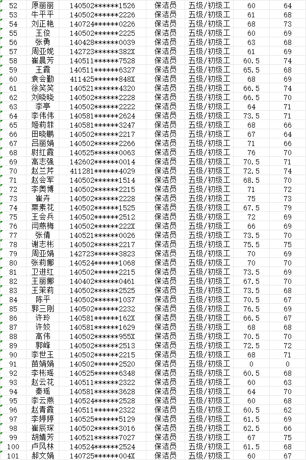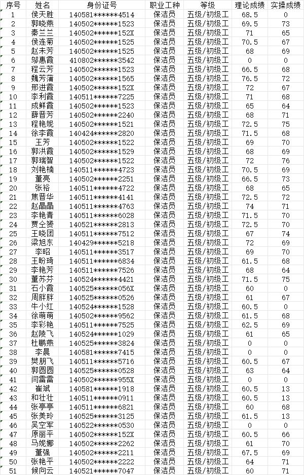 晉城市潔霸清潔服務股份有限公司職業(yè)技能等級認定中心2024年7月28日第26批保潔員初級認定人員成績公示