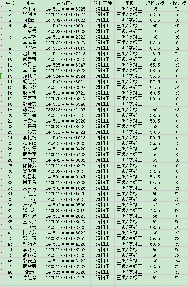 晉城市潔霸清潔服務(wù)股份有限公司職業(yè)技能等級(jí)認(rèn)定中心現(xiàn)將2024年8月3日認(rèn)定人員成績(jī)公示如下: