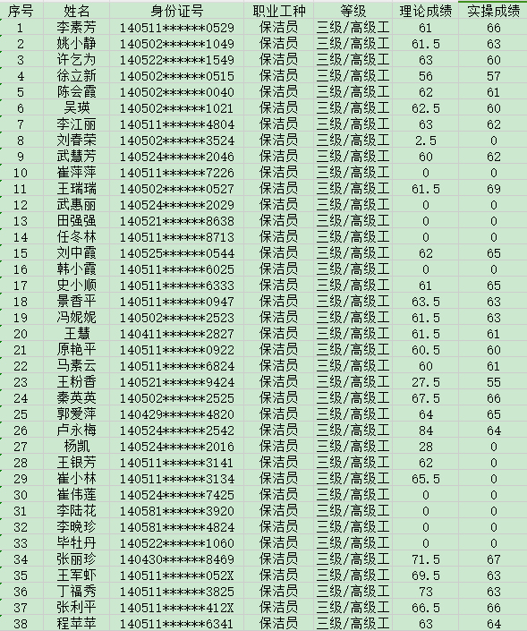 晉城市潔霸清潔服務股份有限公司職業(yè)技能等級認定中心2024年9月1日第36批保潔員高級認定人員成績公示