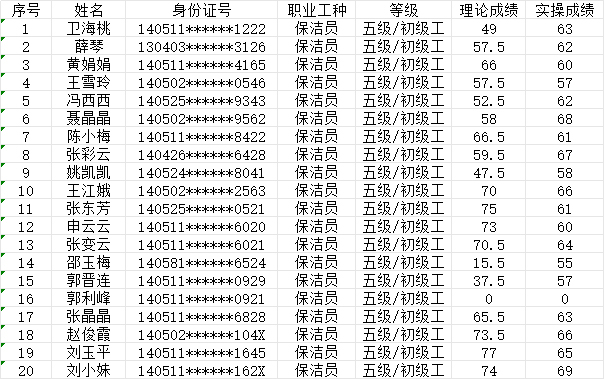 晉城市潔霸清潔服務股份有限公司職業(yè)技能等級認定中心2024年9月14日第37批保潔員初級認定人員成績公示