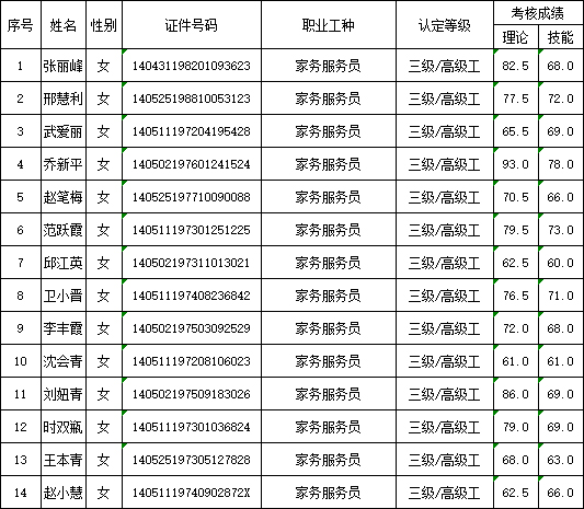 山西潔霸清潔服務(wù)集團(tuán)股份有限公司職業(yè)技能等級認(rèn)定中心現(xiàn)將2025年9月13日認(rèn)定人員成績公示如下:
