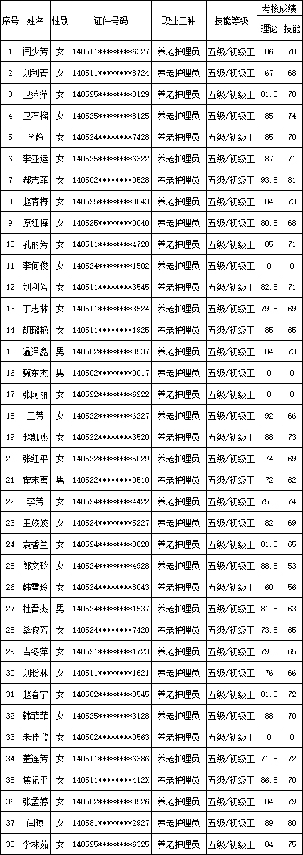 山西潔霸清潔服務(wù)集團(tuán)股份有限公司職業(yè)技能等級(jí)認(rèn)定中心2025年11月9日第2批養(yǎng)老護(hù)理員初級(jí)認(rèn)定人員成績(jī)公示